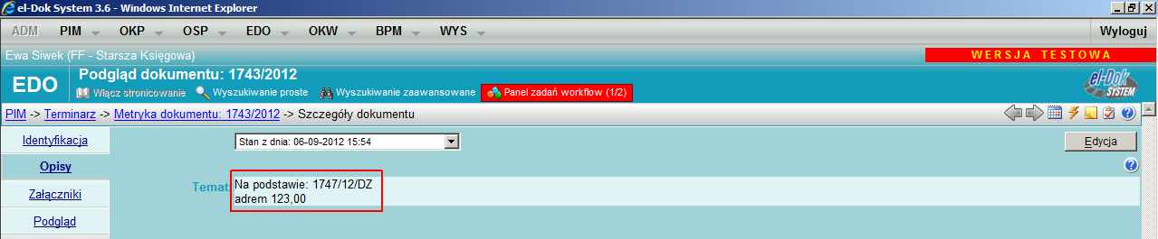 w systemie obiegu dokumentów:
